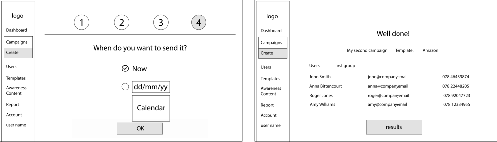 2. Improvement on the current user experience available on http://client.ophish.com/, the business goal being to attract and retain O’Phish customers. This was done by discovering what the user need in order to plan and conduct successful training strategies agains phishing.