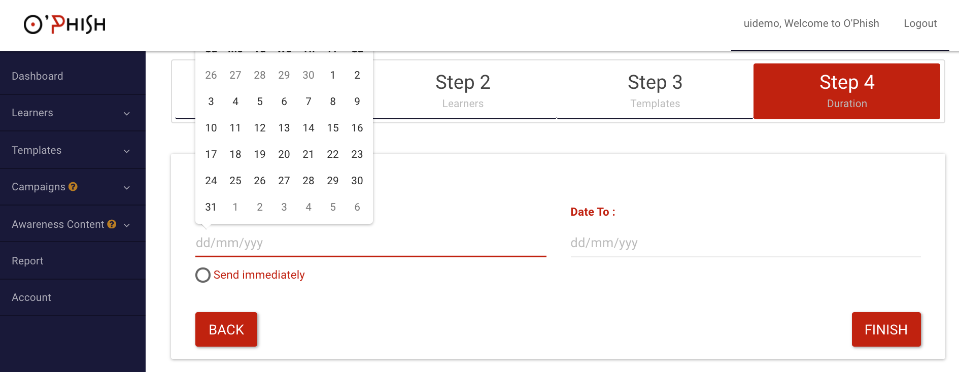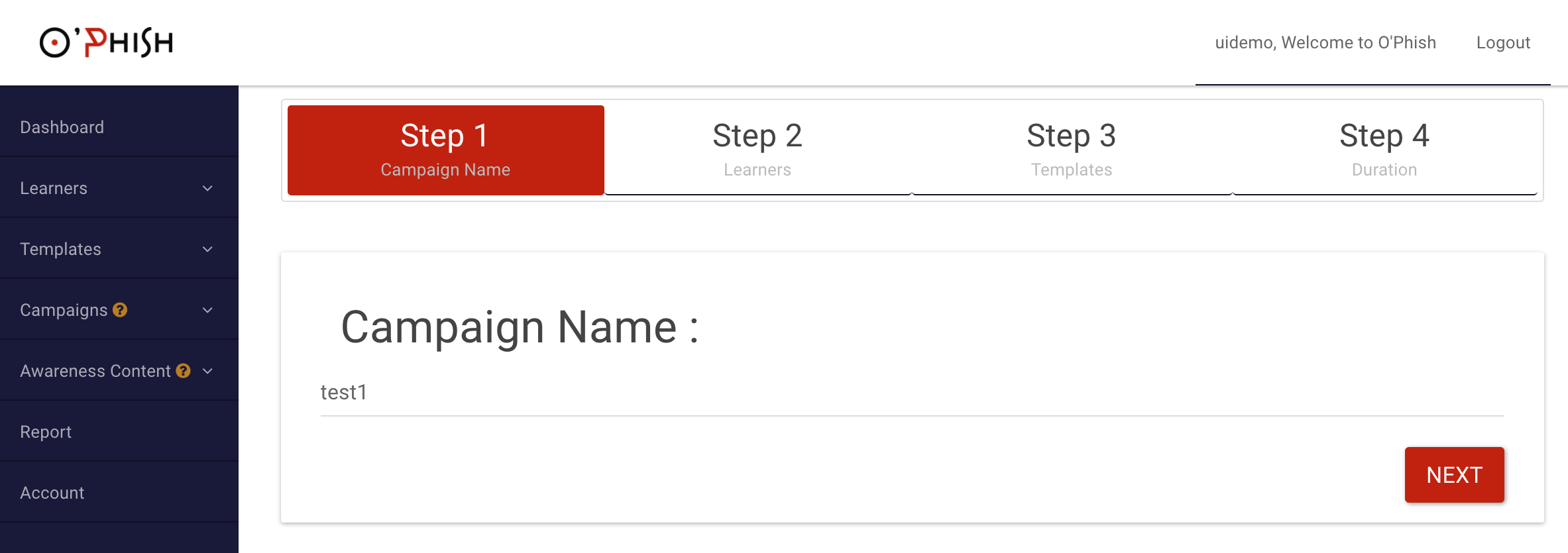 This is a simplified version of “Create a campaign”. It is tailored for the new user that is being introduced to O’Phish. On the internet, the competition is only one click away, so if you frustrate users they will head somewhere else. We ask the minimum information necessary so the user can achieve the main objective: create a campaign, and as a result, fully understand how O’Phish works.