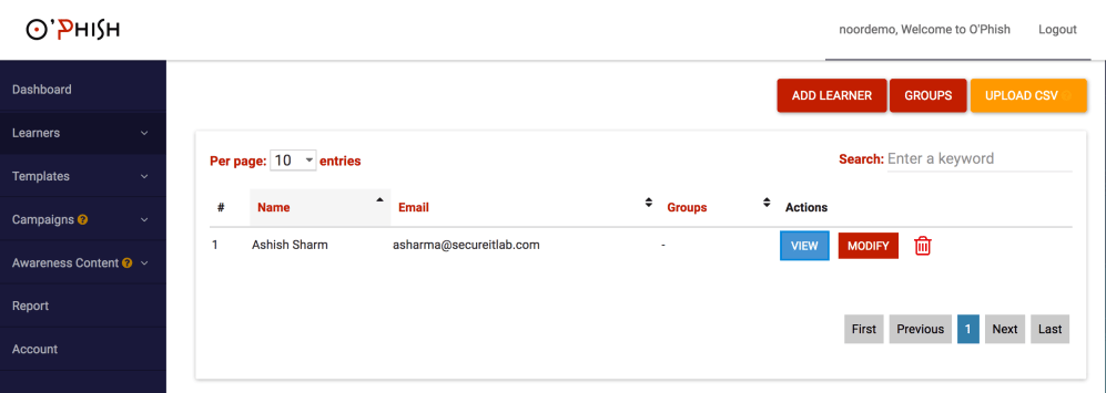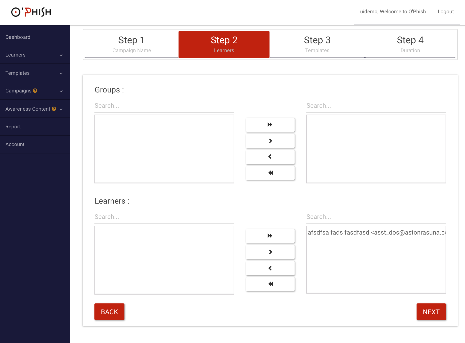 On this stage the user has to add Learners (employees of the user’s company). The word learners gives the impression that O’Phish will provide courses about phishing.