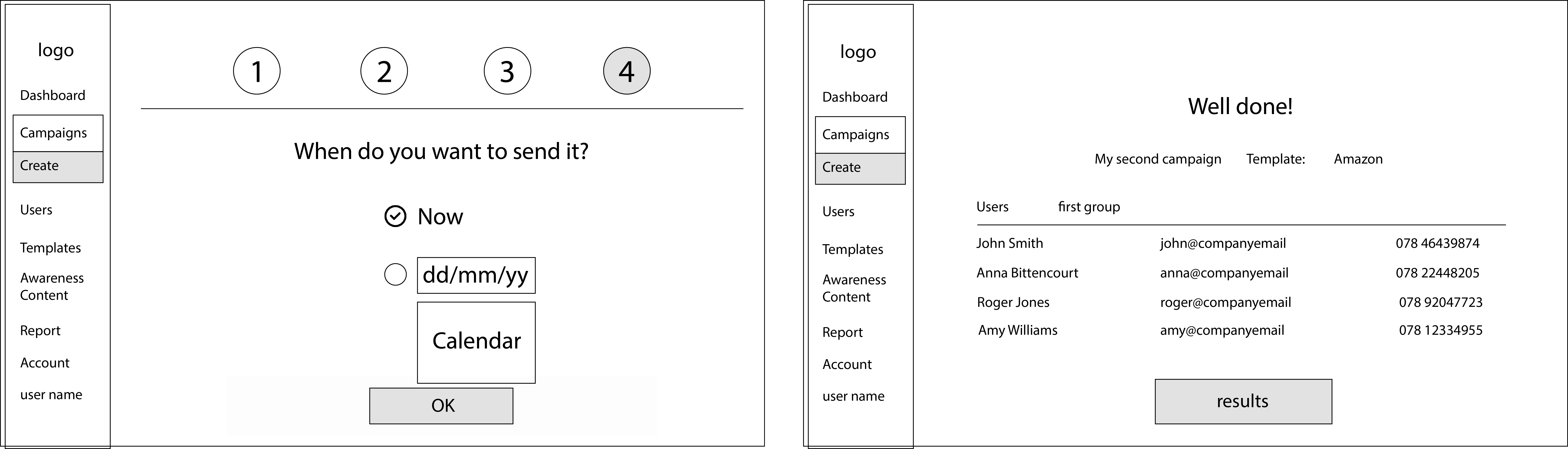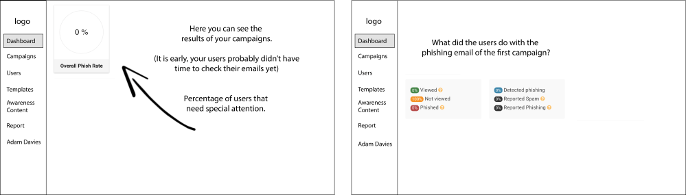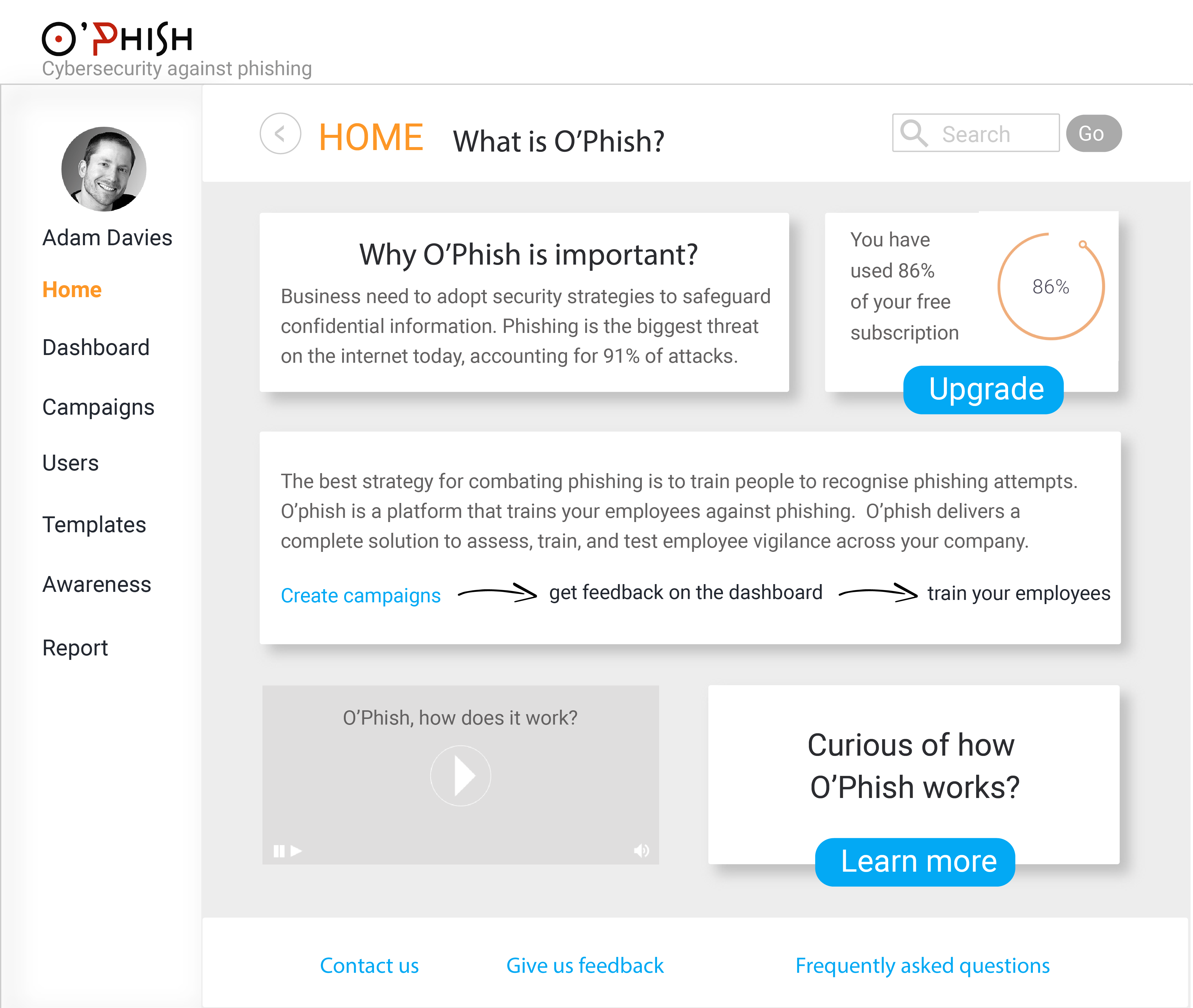 2. Improvement on the current user experience available on http://client.ophish.com/, the business goal being to attract and retain O’Phish customers. This was done by discovering what the user need in order to plan and conduct successful training strategies agains phishing.