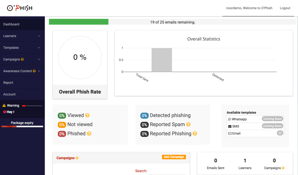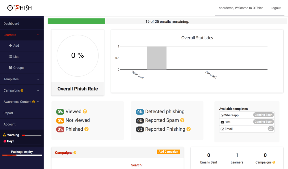 We take the user by the hand and help him to start a campaign right away. Starting a campaign is the kickoff activity at O’Phish. This way, once the user get to the dashboard he will have real data to analyse and will understand the process. The user will know O’Phish’s potential by doing a real activity and will have an incentive to come back to the website to check the results.